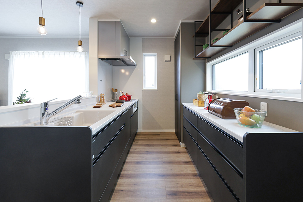 引き締まった色使いで高級感漂うキッチン。食器や食品の収納力も充実。